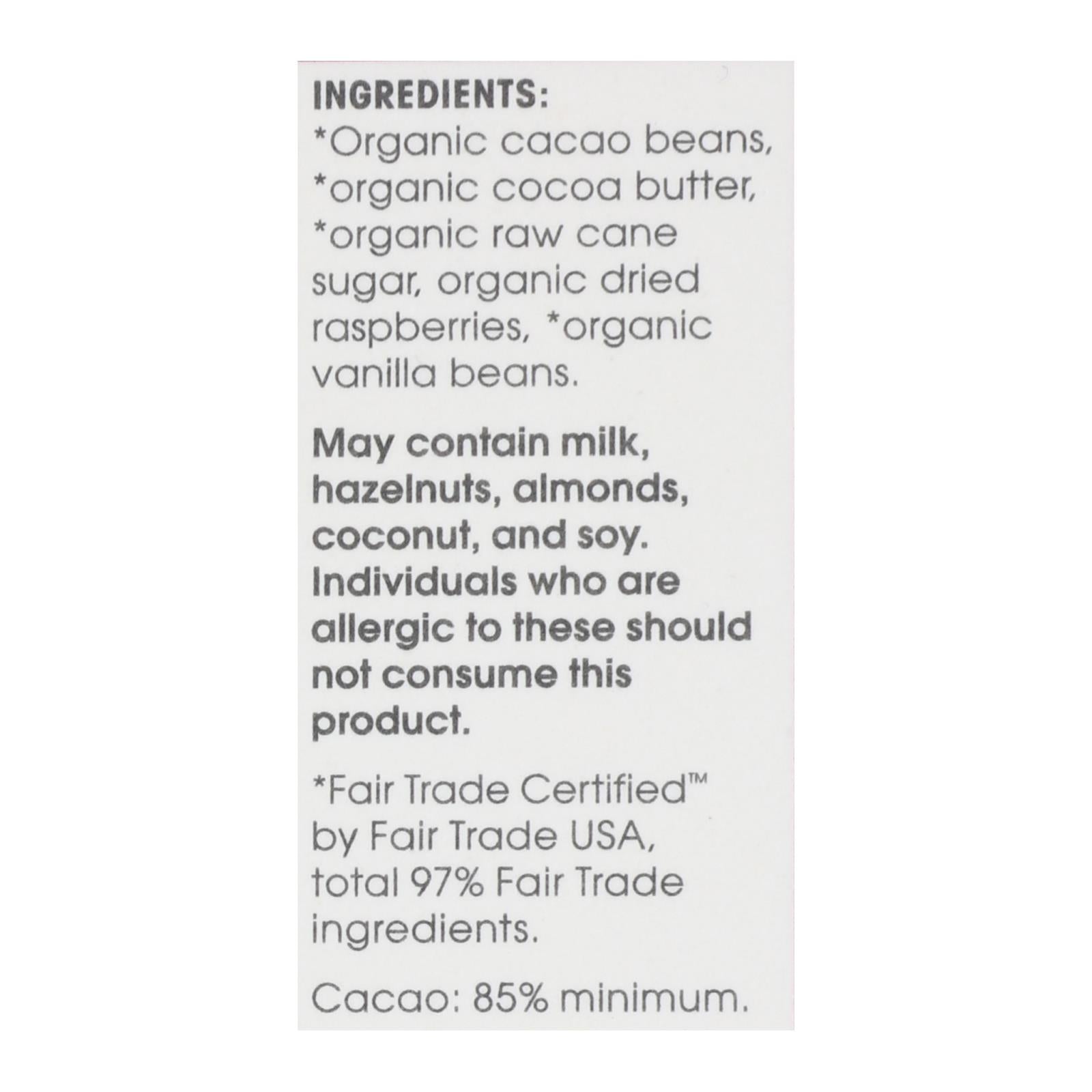 ingredients : organic cacao beans;organic cocoa butter;organic raw cane sugar;organic dried raspberries;organic vanilla beans