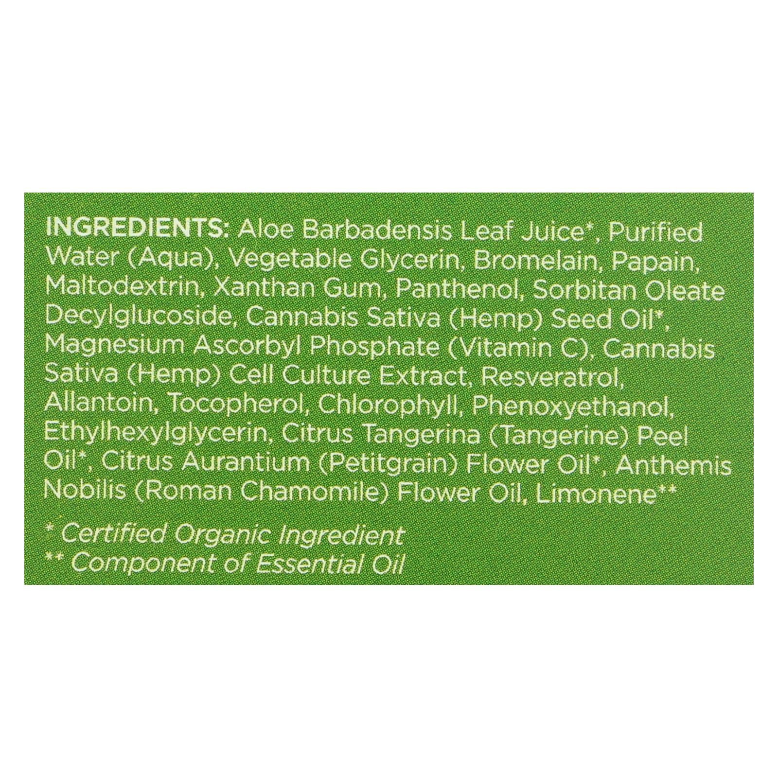 ingredients : aloe barbadensis leaf juice;purified water;aqua;vegetable glycerin;bromelain;papain;maltodextrin;xanthan gum;panthenol;sorbitan oleate decylglucoside;cannabis sativa;hemp;seed oil;magnesium ascorbyl phosphate;vitamin c;cell culture extract;resveratrol;allantoin;tocopherol;chlorophyll;phenoxyethanol;ethylhexyglycerin;citrus tangerina;tangerine;peel oil;citrus aurantium;petitgrain;flower oil;anthemis nobilis;roman chamomile;limonene