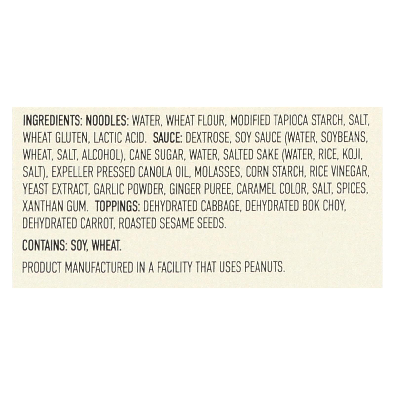 ingredients : noodles: water;wheat flour;modified tapioca starch;salt;wheat gluten;lactic acid. Sauce: dextrose;soy sauce;water;soybeans;wheat;alcohol;cane sugar;salted sake;rice;koji;expeller pressed canola oil;molasses;corn starch;rice vinegar;yeast extract;garlic powder;ginger puree;caramel color;spices;xanthan gum. Toppings: dehydrated cabbage;dehydrated bok choy;dehydrated carrot;roasted sesame seeds