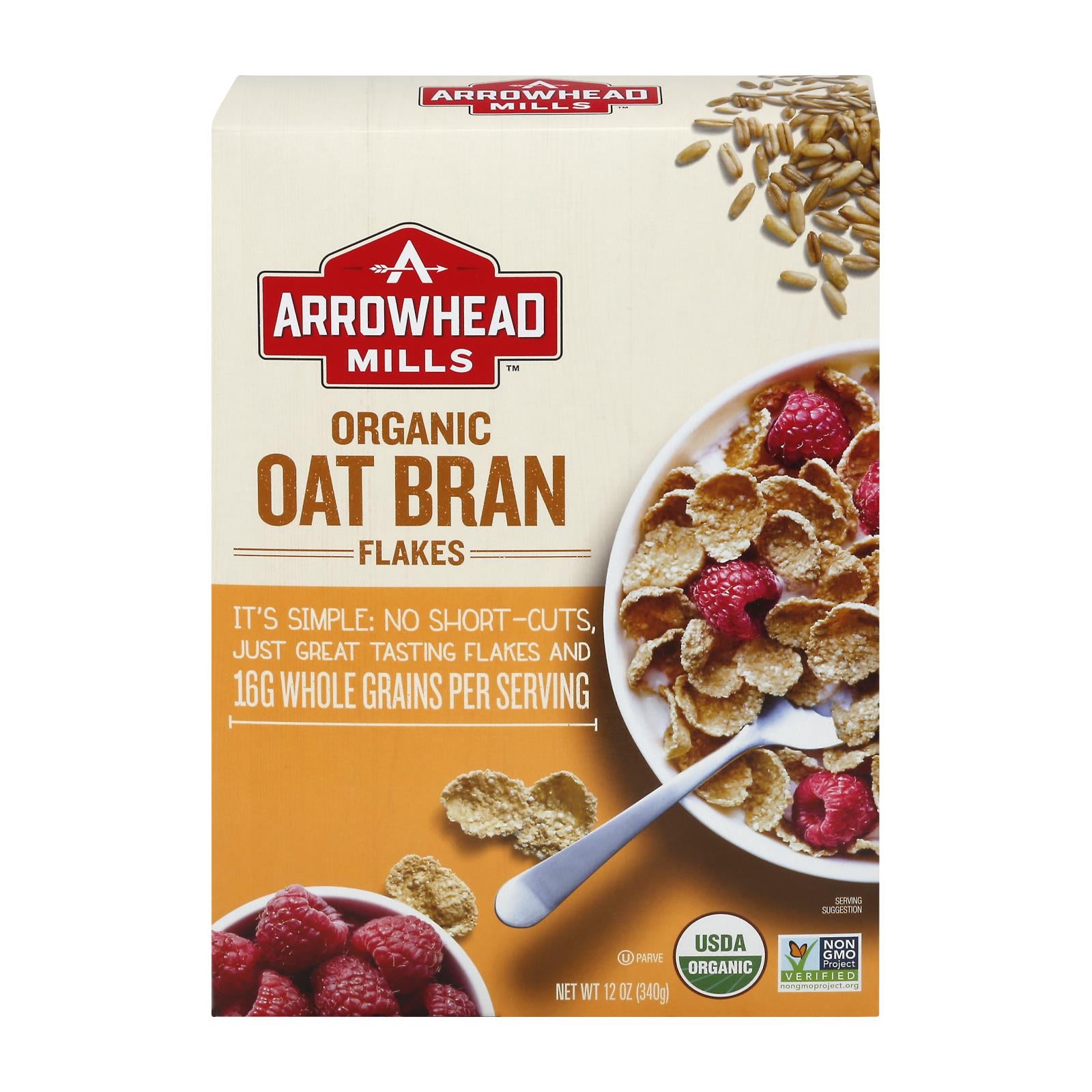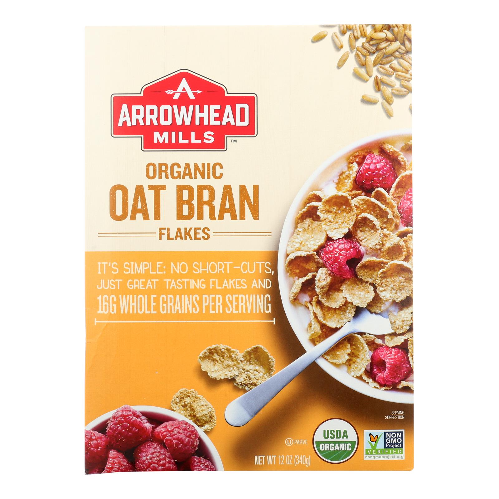 Usda organic. Certified organic by quality assurance international (qai). 100% whole grain: 16 g or more per serving. Eat 48 g or more of whole grains daily. Wholegrainscouncil.org. Low fat. Good source of fiber. Non gmo project verified. Nongmoproject.org. It's simple: no short-cuts, just great tasting flakes and 15 g whole grains per serving. This breakfast favorite is formulated with organic ingredients from oats, including oat bran. With 16 g of whole grain and a good source of dietary fiber per serving, organic oat bran flakes is a nutritious and delicious start to every morning. Arrowhead mills brand was born in the texas panhandle back in 1960. We've grown, but we haven't changed how we do things. We're still using our same trusted milling process and building long-term relationship with our growers, working with them face-to-face, day-to-day. Hard work, honesty, kindness, and business with a handshake - that's our process. That's the arrowhead way. It's how we bring the awesome goodness of the land to your table, and we're real proud of it. Oat bran flakes: organic oat bran flakes were developed based on the principle that great tasting food can also be wholesome and nutritious. Www.arrowheadmills.com. Comments? please send upc and manufactured code date along with your comments to: arrowhead mills consumer relations 4600 sleepytime dr., boulder co 80301 or call 800-474-6552 or visit www.arrowheadmills.com.