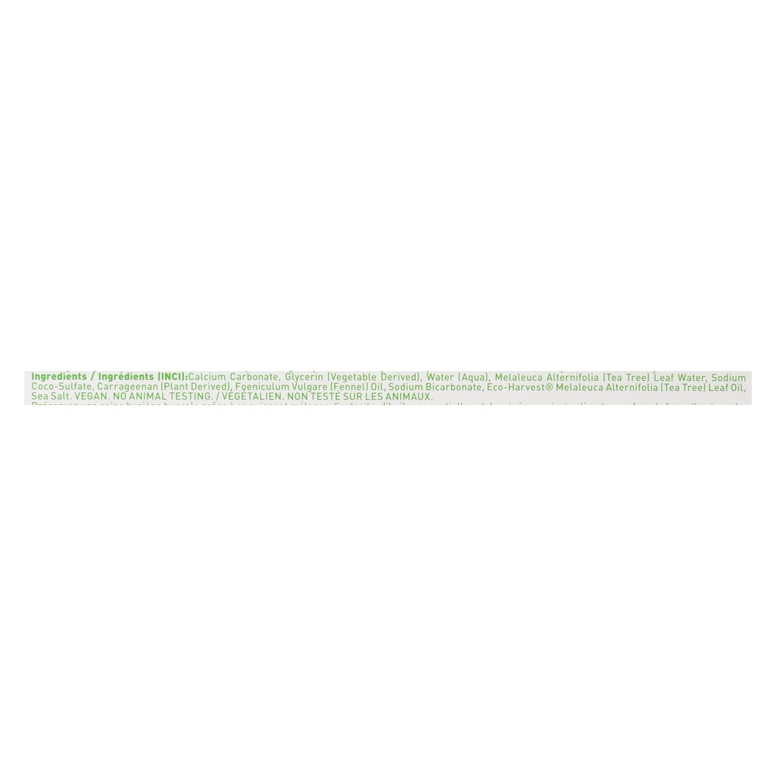 ingredients : calcium carbonate;glycerin;vegetable derived;water;aqua;melaleuca alternifolia;tea tree;leaf water;sodium coco-sulfate;carrageenan;plant derived;foeniculum vulgare;fennel;oil;sodium bicarbonate;eco-harvest® melaleuca alternifolia;leaf oil;sea salt