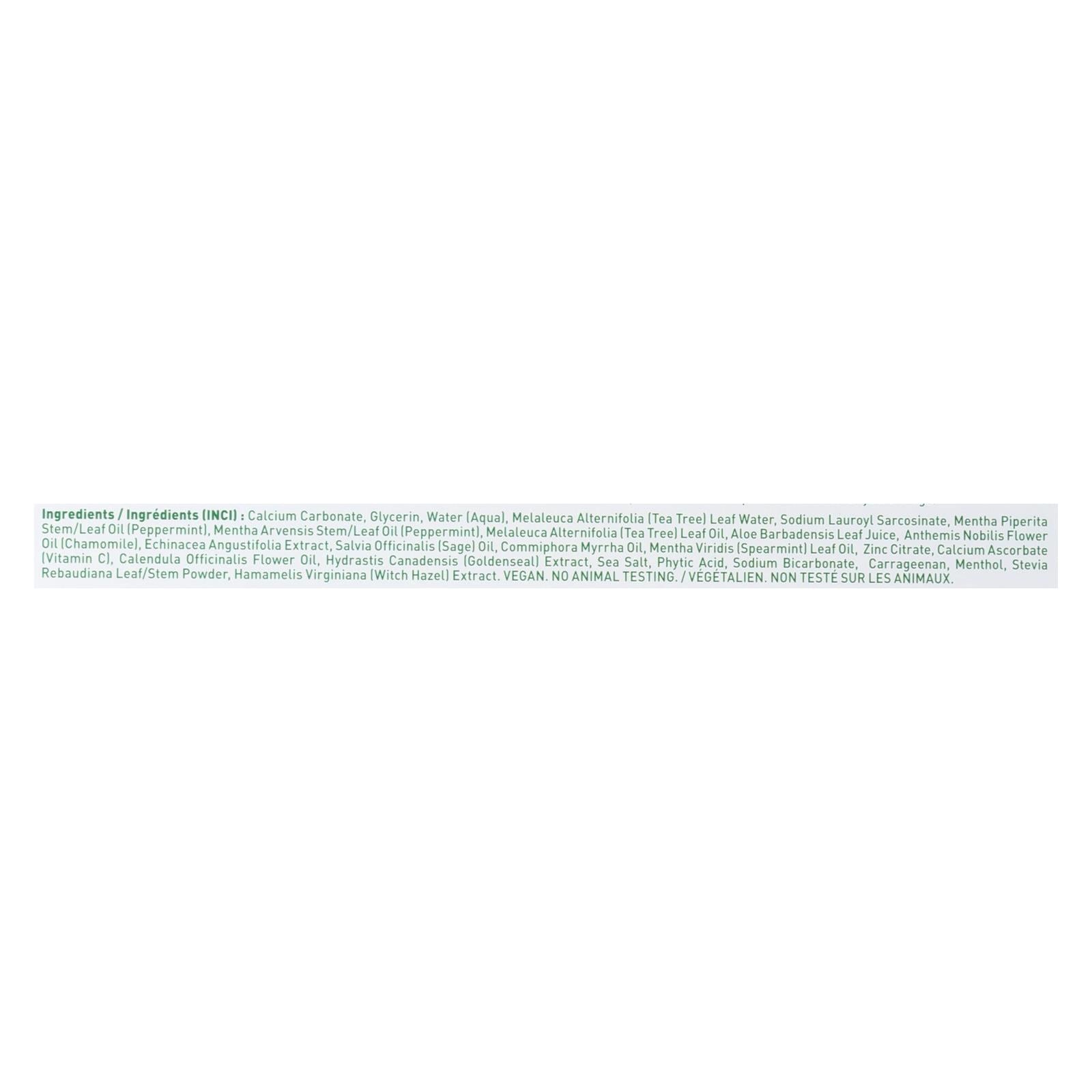 ingredients : calcium carbonate;glycerin;water;aqua;melaleuca alternifolia;tea tree;leaf distillate;sodium lauroyl sarcosinate;mentha piperita stem/leaf oil;peppermint;mentha arvensis stem/leaf oil;leaf oil;aloe barbadensis leaf juice;anthemis nobilis flower oil;chamomile;echinacea angustifolia extract;salvia officinalis;sage;oil;commiphora myrrha oil;mentha viridis;spearmint;zinc citrate;calcium ascorbate;vitamin c;calendula officinalis flower oil;hydrastis canadensis;goldenseal;extract;sea salt;phytic acid;