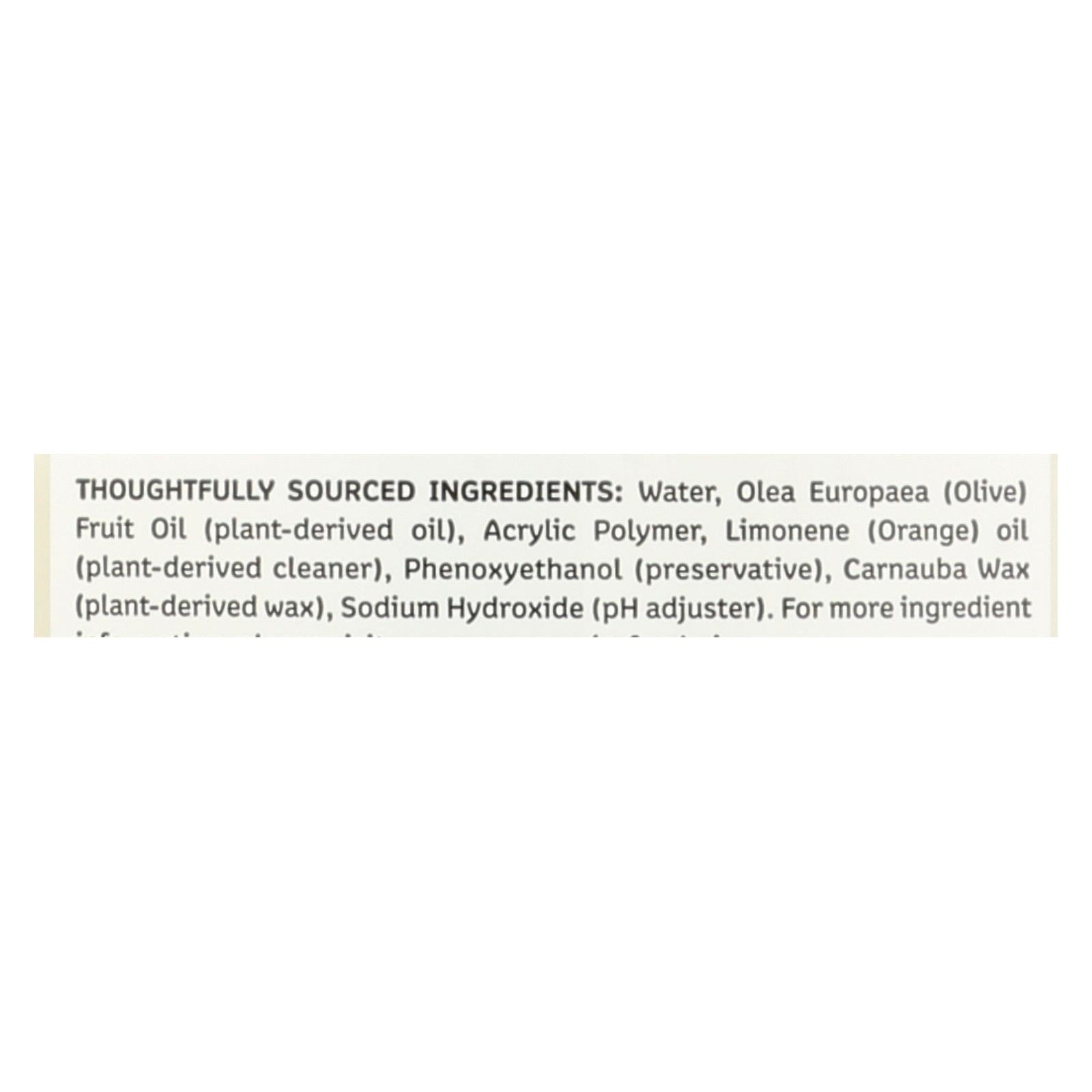 ingredients : thoughtfully sourced water;olea europaea;olive;fruit oil;plant-derived oil;acrylic polymer;limonene;orange;oil;plant-derived cleaner;phenoxyethanol;preservative;carnauba wax;plant-derived wax;sodium hydroxide;ph adjuster