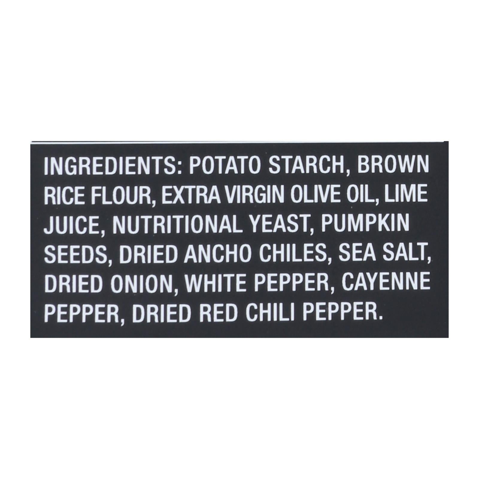 ingredients : potato starch;brown rice flour;extra virgin olive oil;lime juice;pumpkin seeds;nutritional yeast;ancho chiles;sea salt;onion;cayenne;white pepper;red chile pepper