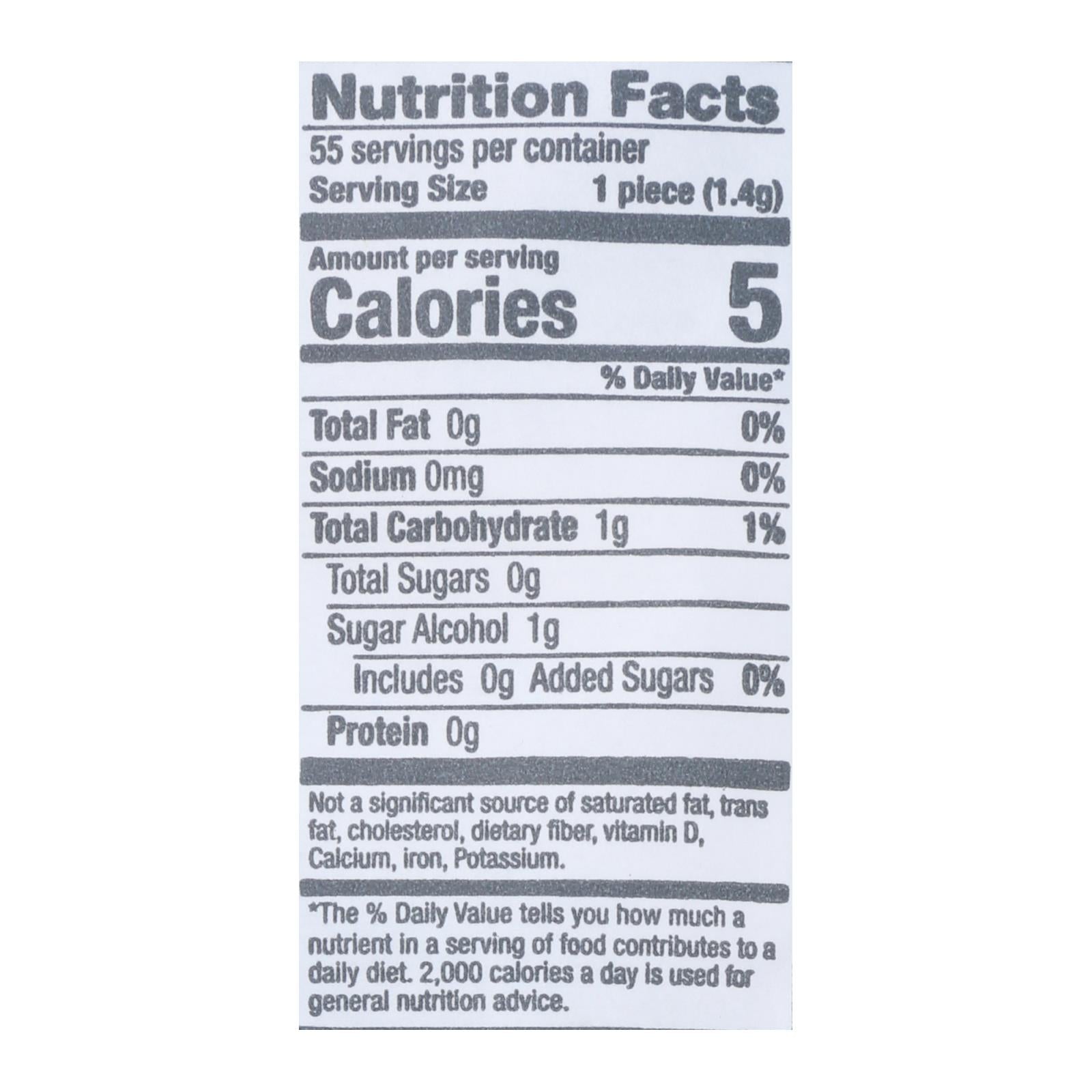 ingredients : xylitol;gum base (chicle, calcium carbonate, candelilla wax, citrus acid);natural peppermint flavor;gum arabic;carnauba wax