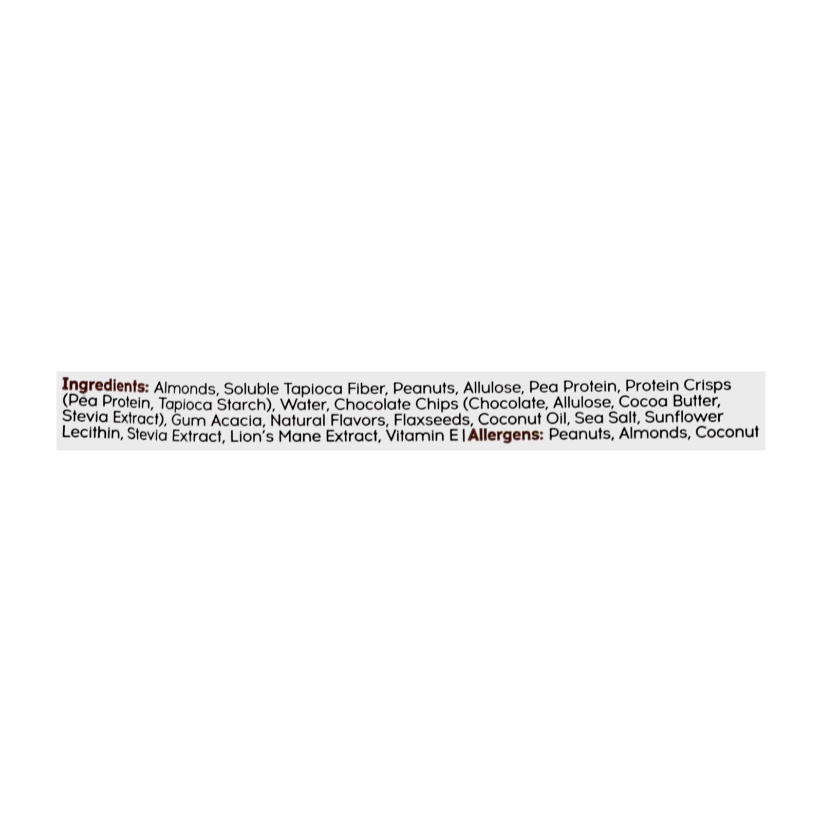 ingredients : nuts (peanuts, almonds);tapioca fiber;plant-based protein crisps (pea protein, tapioca starch);natural flavors;pea protein;flaxseeds;peanut flour;unsweetened chocolate;gum acacia;coconut oil;cocoa butter;sunflower lecithin;sea salt;water;non-gmo steviol glycosides;lion's mane;vitamine