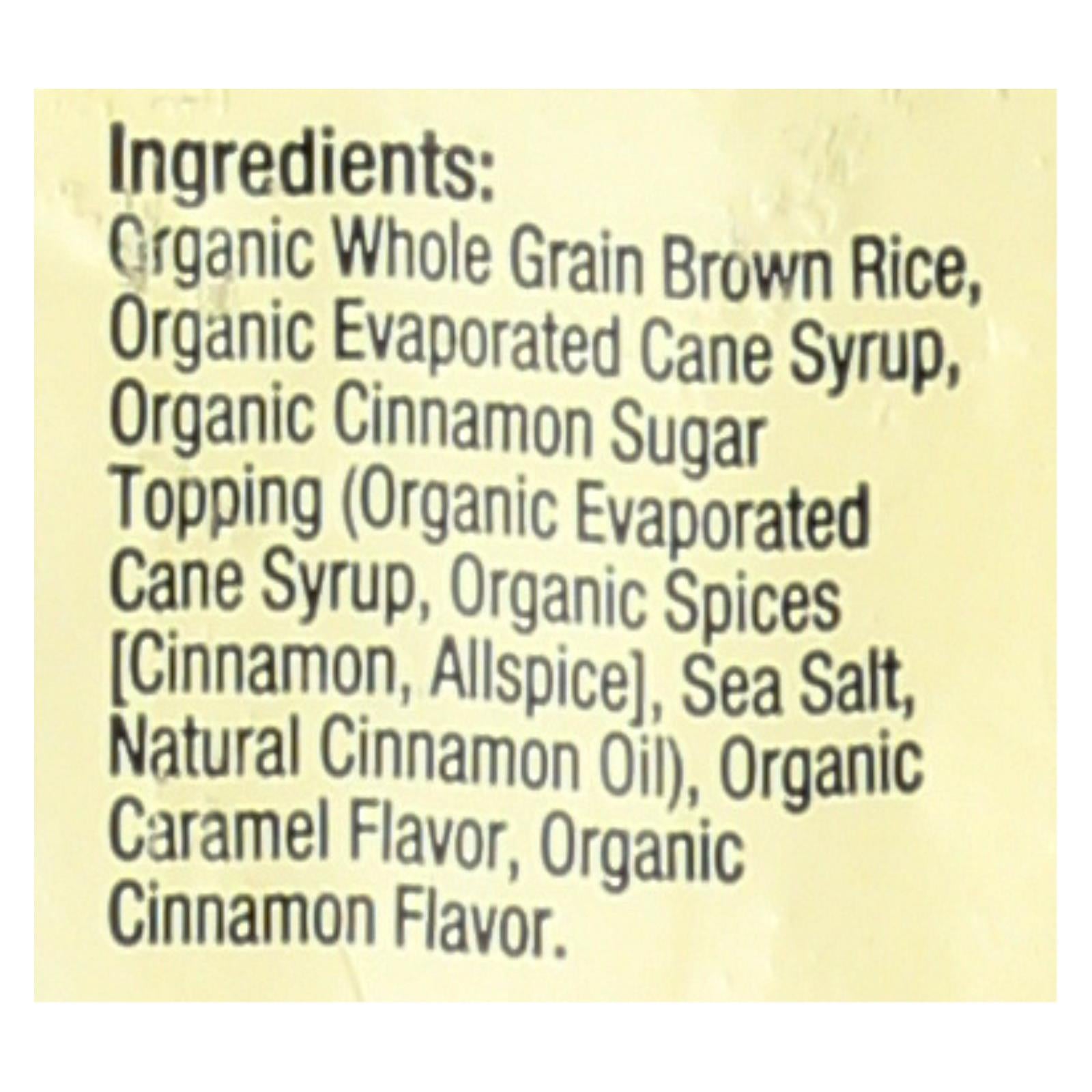 ingredients : organic whole grain brown rice;organic evaporated cane syrup;organic cinnamon sugar topping;organic spices [cinnamon;allspice];sea salt;natural cinnamon oil;organic caramel flavor;organic cinnamon flavor