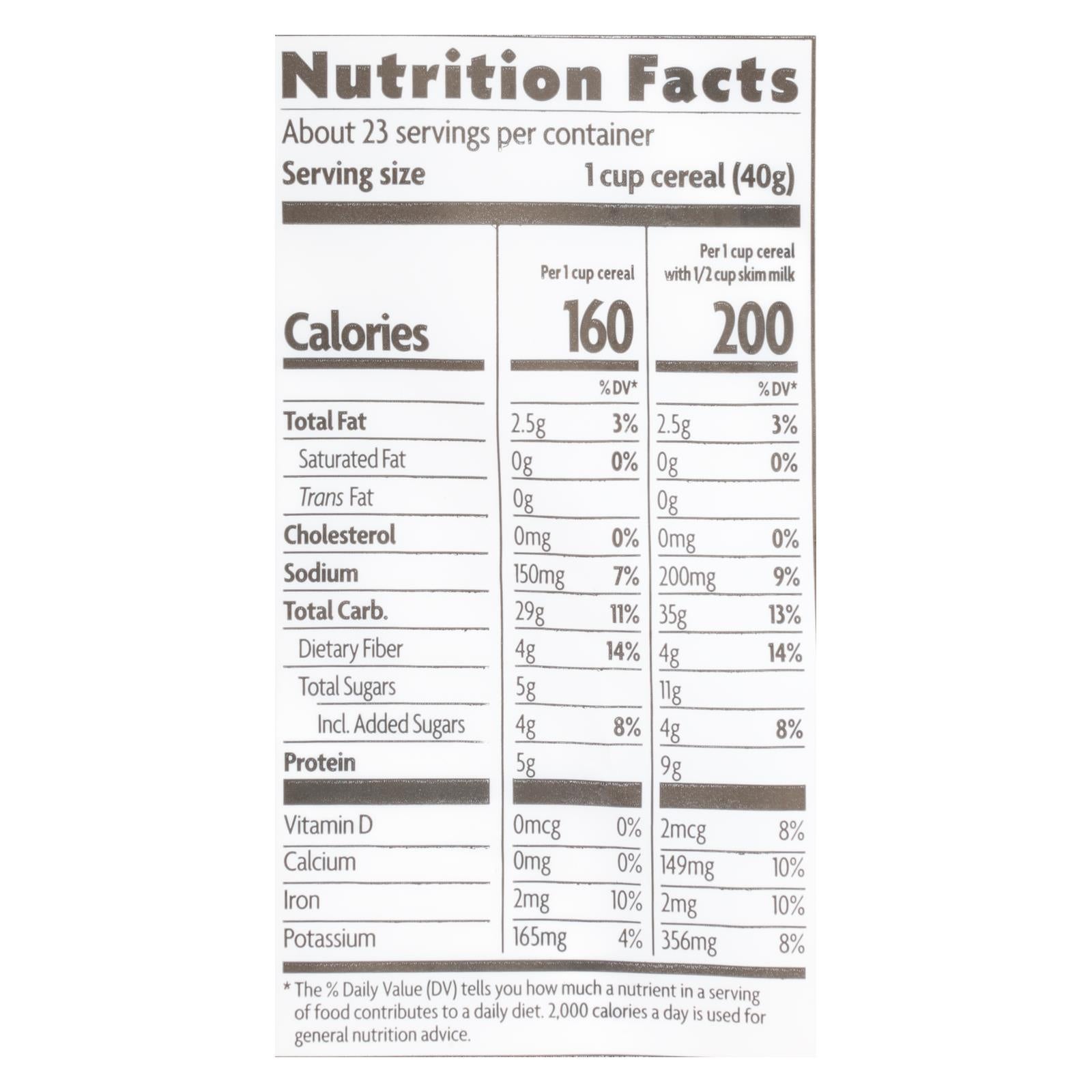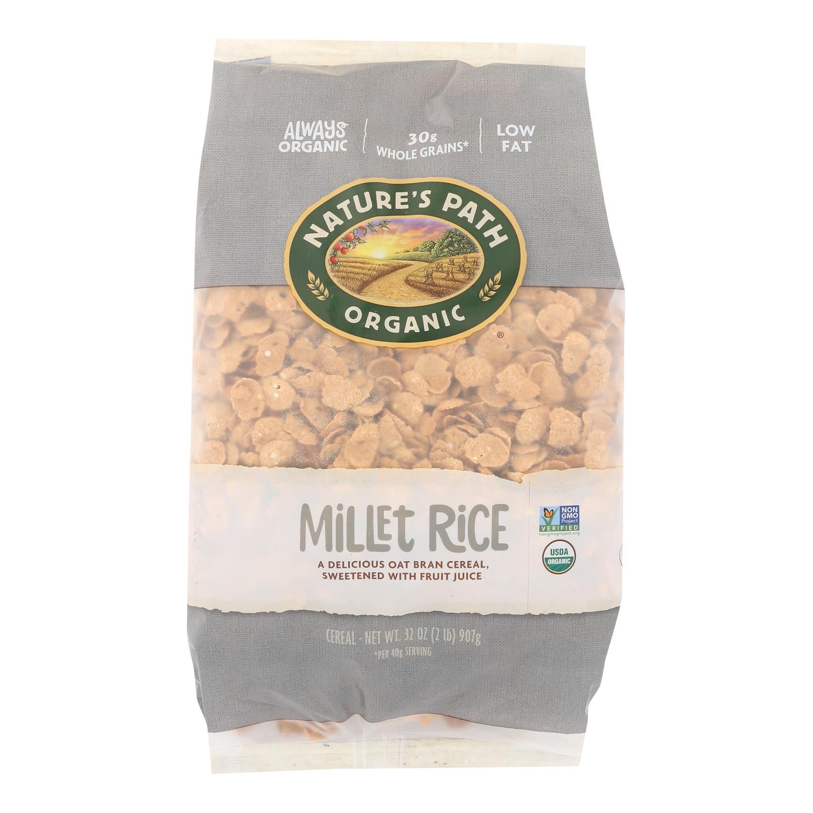 Nature’s path millet rice cereal is a low fat cereal, enriched with oat bran and sweetened with fruit juice. The whole grain flakes are non-gmo, kosher and usda organic certified. We do not use artificial additives or preservatives. The product includes one 32 oz. Bag. See nutrition facts panel for allergens.