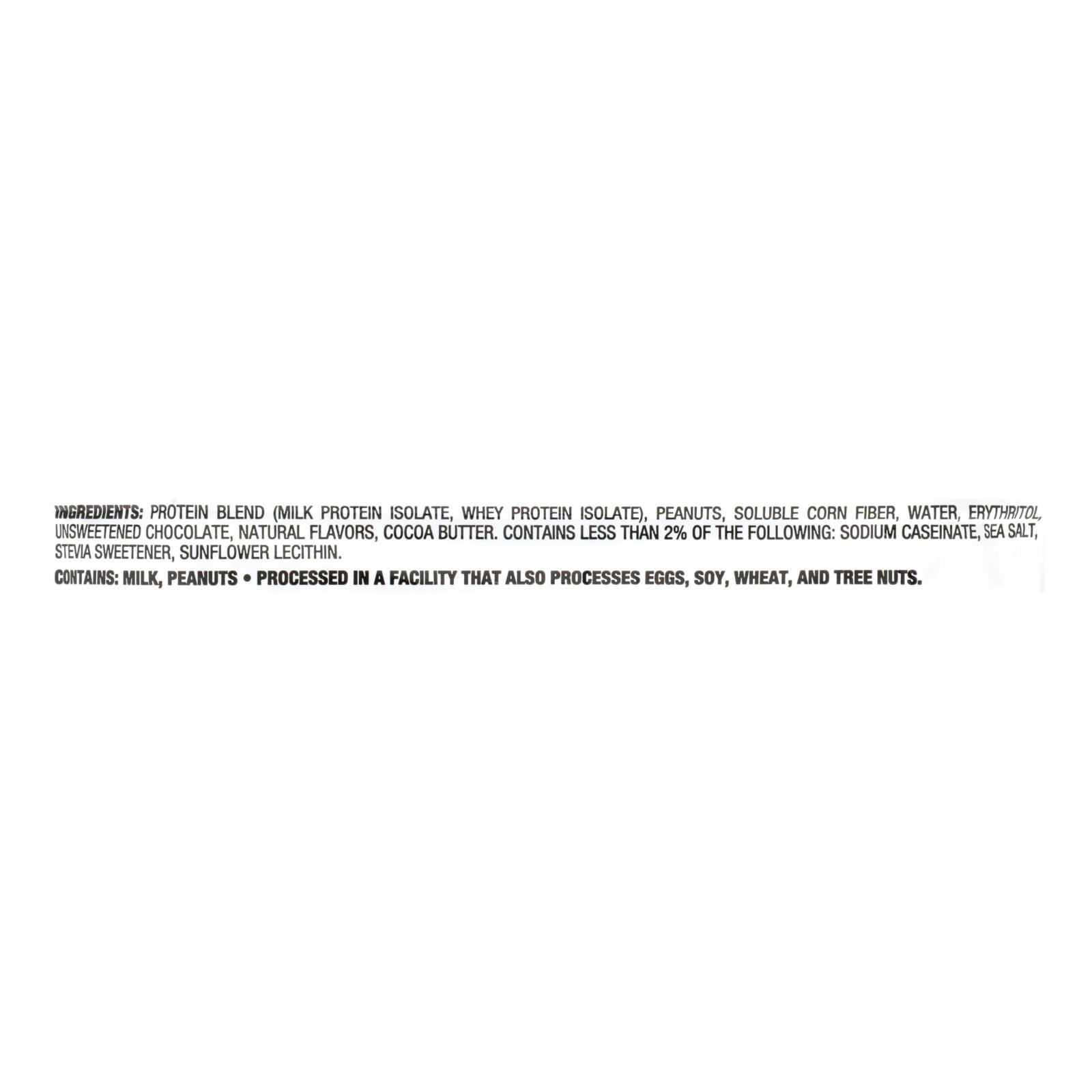 ingredients : protein blend;milk protein isolate;whey protein isolate;peanuts;soluble corn fiber;water;erythritol;unsweetened chocolate;natural flavors;cocoa butter. Contains less than 2% of the following: sodium caseinate;sea salt;stevia sweetener;sunflower lecithin