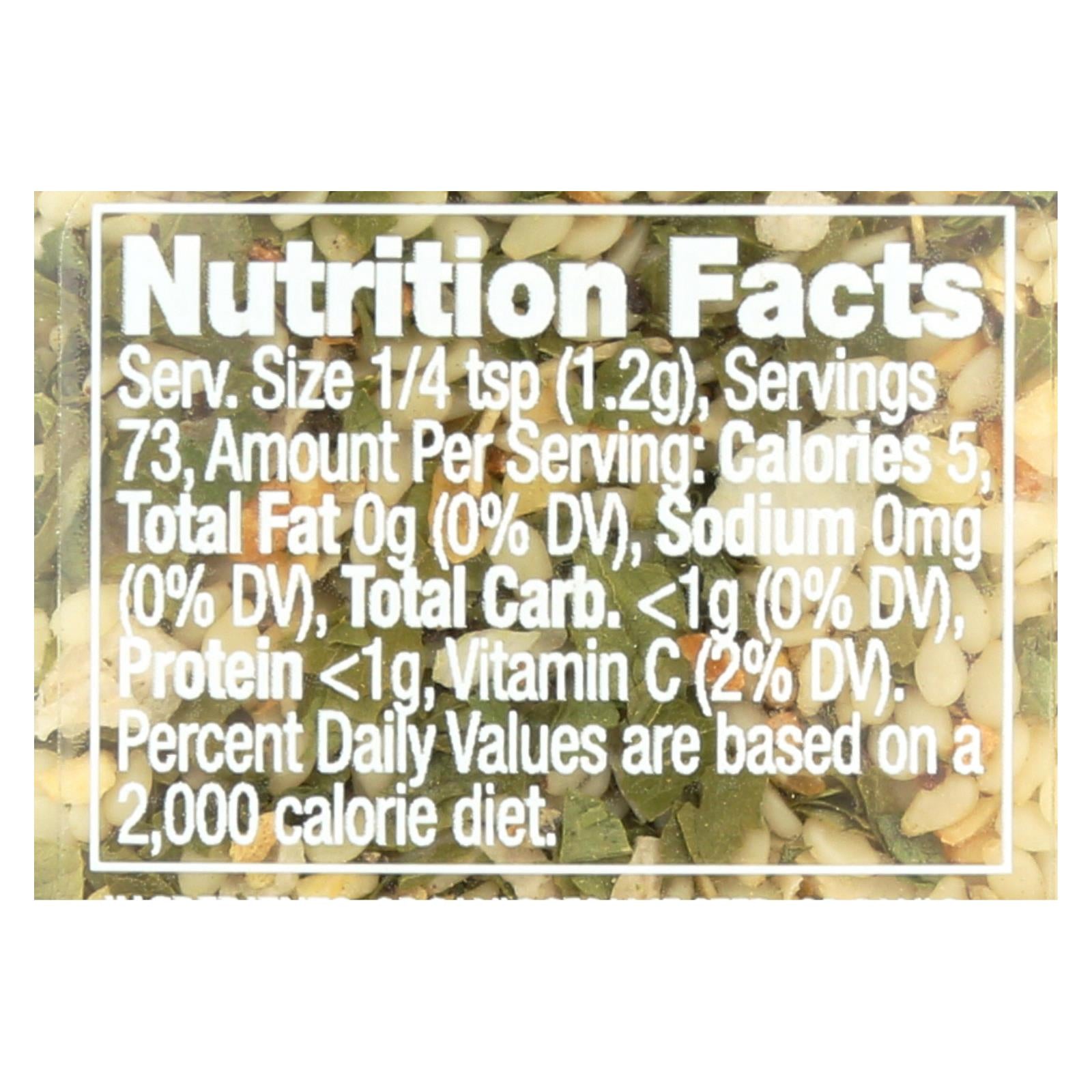 Simply organic garlic n herb is a 100% usda- and qai-certified organic food product. This organic seasoning comes in one 3.1 oz. Glass bottle and has 0 g. Of fat. Additionally, it has just 5 calories, less than 1 g. Of carbohydrates, less than 1 g. Of protein and 0 mg. Of sodium per serving. It is certified kosher-parve.