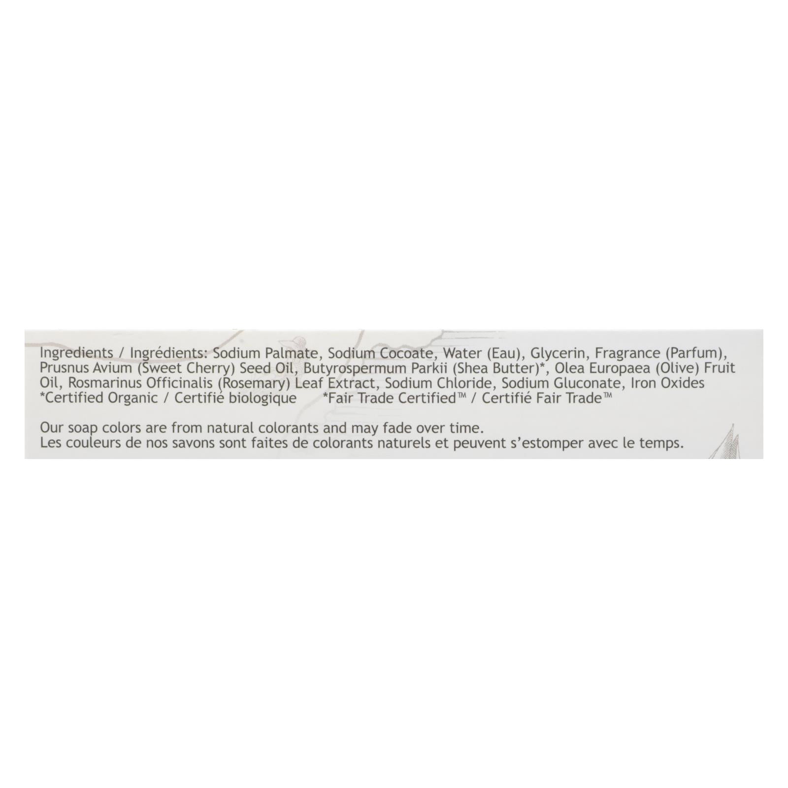 ingredients : sodium palmate;sodium cocoate;water;eau;glycerin;fragrance;parfum;prusnus avium;sweet cherry;seed oil;butyrospermum parkii;shea butter;olea europaea;olive;fruit oil;rosmarinus officinalis;rosemary;leaf extract;sodium chloride;sodium gluconate;iron oxides