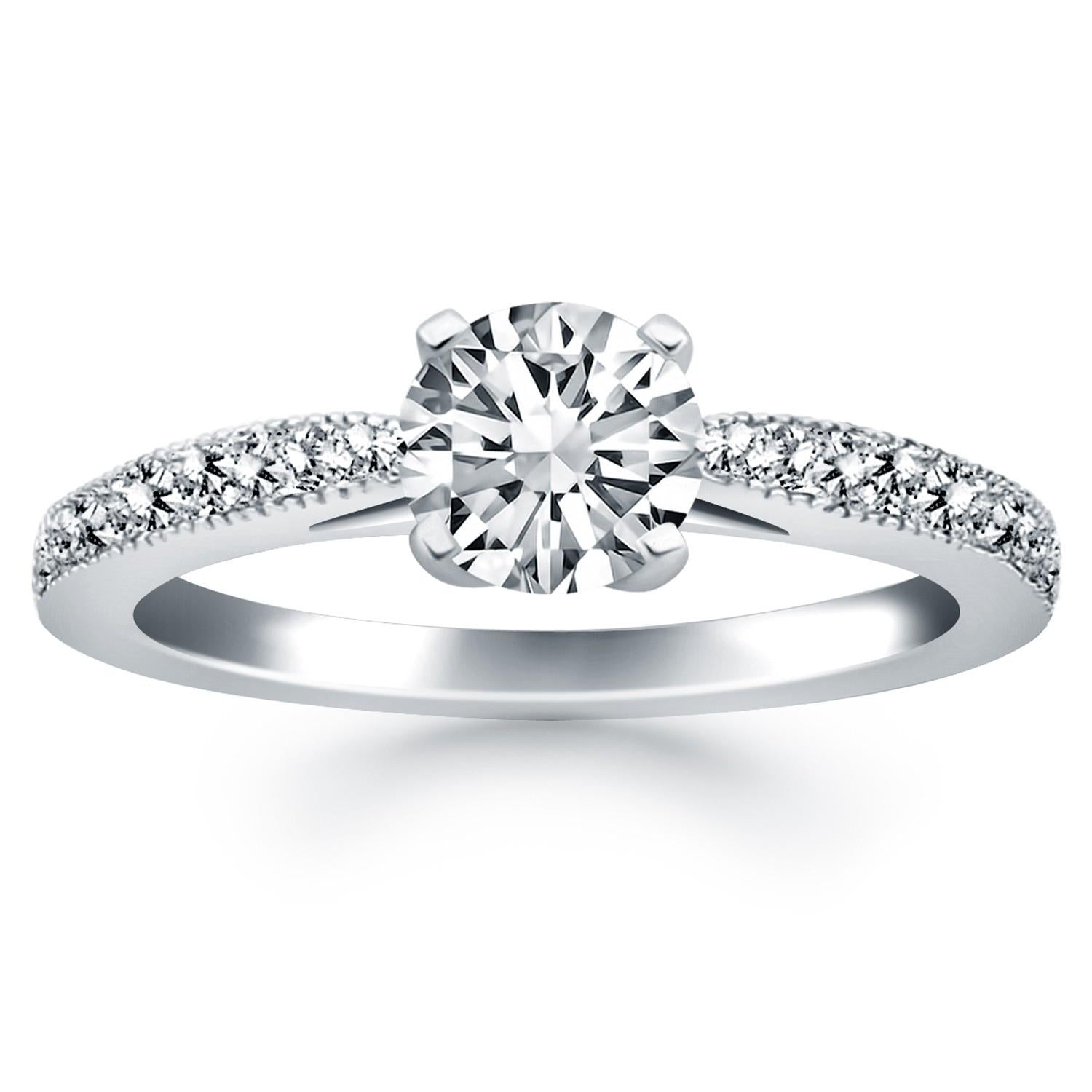Our classic cathedral engagement ring gets encrusted with glittering pave set diamonds surrounded with milgrain borders in this stunning design. The silhouette has all the features you would come to expect, graceful tapers, milgrain edges, and expertly crafted in 14k white gold. The center highlights a sparkling 1/2 carat round cut diamond.