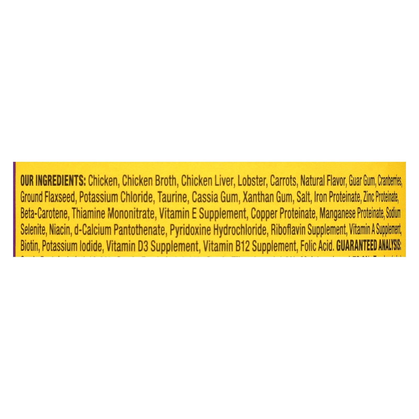 ingredients : chicken;chicken broth;chicken liver;lobster;carrots;natural flavor;guar gum;cranberries;ground flaxseed;potassium chloride;taurine;cassia gum;xanthan gum;salt;iron proteinate;zinc proteinate;beta-carotene;thiamine mononitrate;vitamin e supplement;copper proteinate;manganese proteinate;sodium selenite;niacin;d-calcium pantothenate;pyridoxine hydrochloride;riboflavin supplement;vitamin a supplement;biotin;potassium iodide;vitamin d3 supplement;vitamin b12 supplement;folic acid;crude protein;min;10