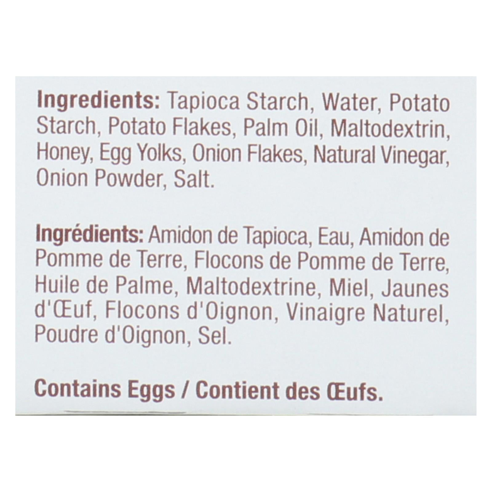 ingredients : tapioca starch;water;potato starch;potato flakes;palm oil;maltodextrin;honey;egg yolks;onion flakes;natural vinegar;onion powder;salt