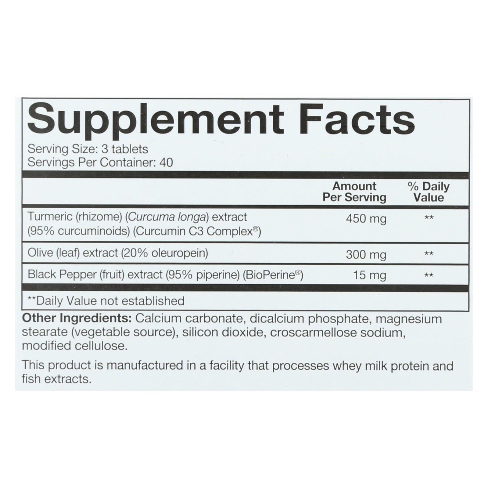 Youtheory turmeric advanced dietary supplement is a tablet-derived supplemental source of nutrition. Its ingredients include turmeric extract and olive extract. Turmeric advanced is a source of antioxidants and supports a healthy inflammation response. The bottle contains 120 tablets. See the nutrition facts panel for allergens.